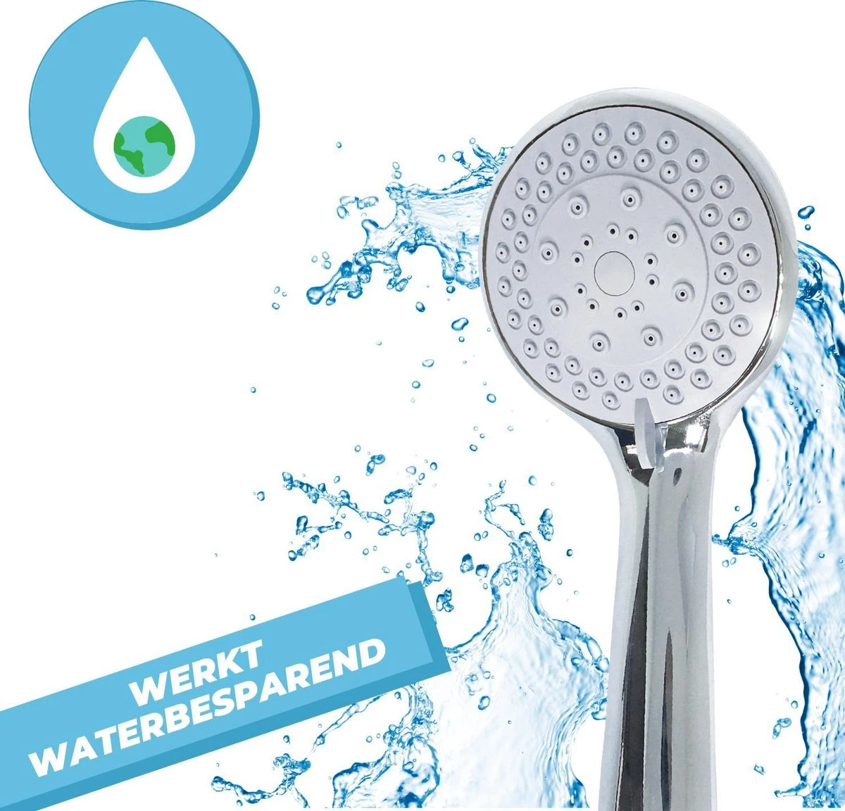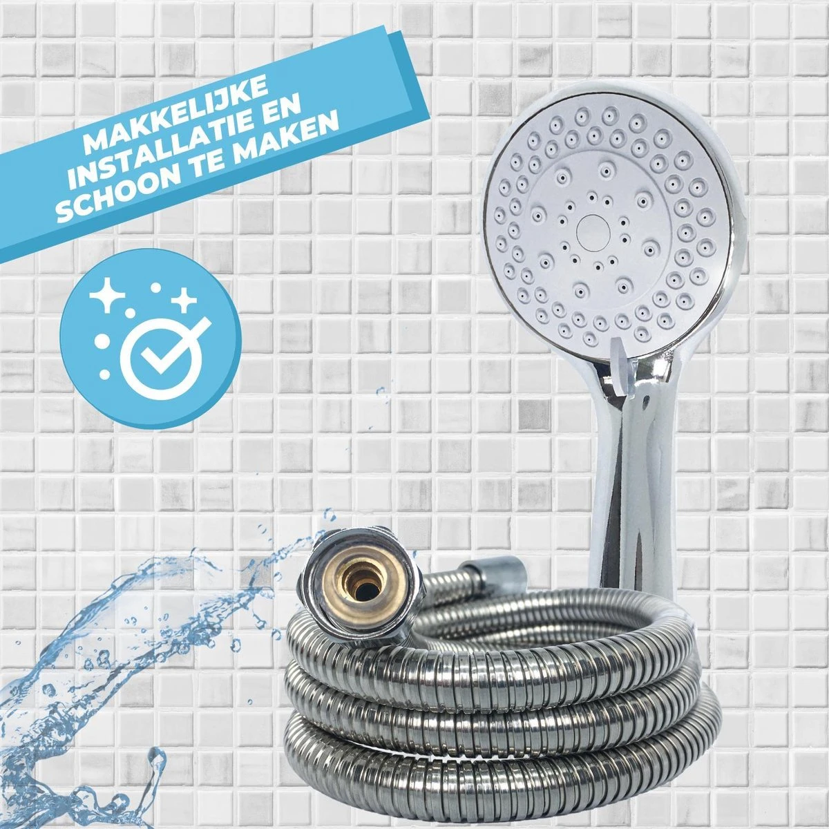 De douchekop met slang heeft een universele bevestiging waardoor hij overal past. De douchekop wordt geleverd inclusief een wandhouder met de benodigde installatie schroeven. Verder is hij ook makkelijk schoon te maken door de het filtersysteem dat geintegreerd is in de douchekop. Ten slotte werkt de douchekop waterbesparend dus hierdoor houdt u ook meteen rekening met het milieu en uw waterrekening.