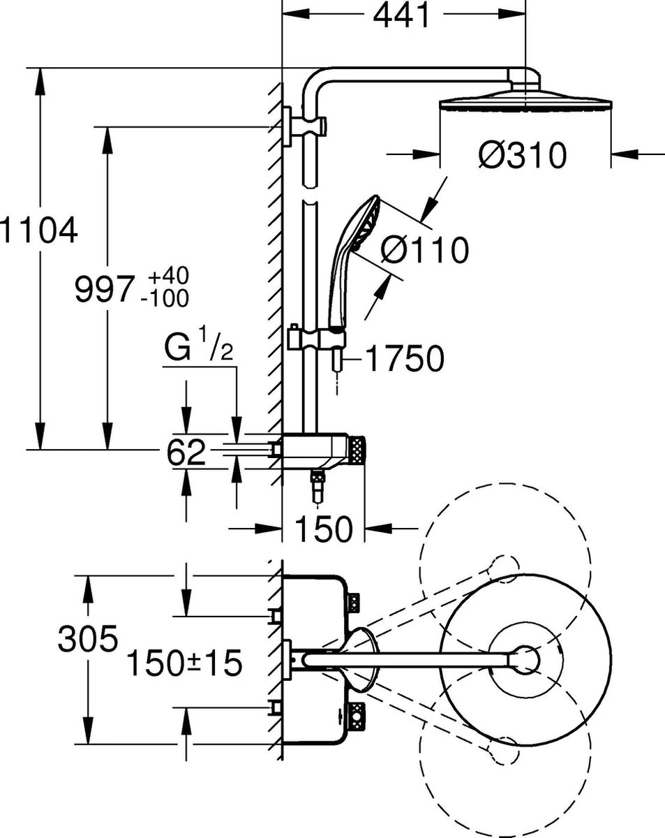 De 310 mm draaibare hoofddouche heeft twee straalmogelijkheden: de GROHE PureRain Spray, die zacht aanvoelt als een rustgevende regendruppel, plus de nieuwe GROHE ActiveRain Spray die geweldig stimulerend aanvoelt en krachtig genoeg is om je shampoo uit te spoelen. De 110 mm handdouche bied je de keuze uit drie verschillende sproeipatronen – de rustgevende regen, de waterbesparende SmartRain en de verkwikkende Massage Spray. GROHE DreamSpray zorgt ervoor dat de stroom van elk sproeigaatje gelijk blijft, ongeacht de straal waar je voor kiest. SpeedClean- siliconen sproeigaatjes zijn ontworpen om de kalkaanslag in een handomdraai weg te kunnen vegen.