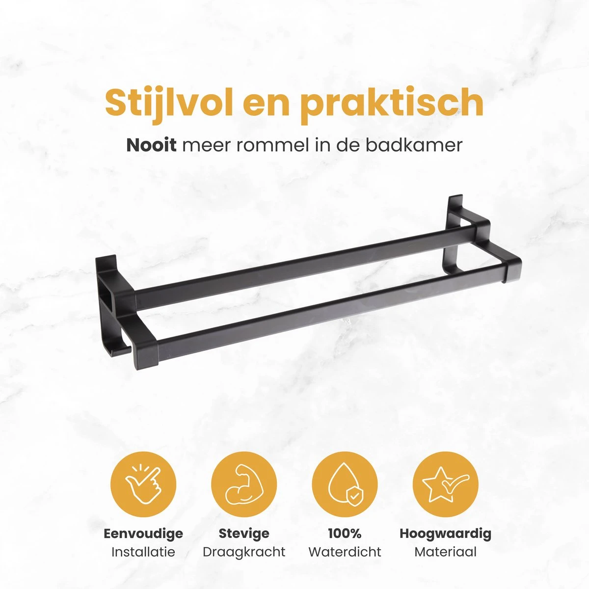 Het zwarte dubbele stang handdoekenrek is van aluminium en heeft daardoor een lichtgewicht. Het minimalistische ontwerp heeft een luxe, moderne uitstraling en past daardoor in elk interieur. Hang het handdoekrek in de badkamer of in de keuken en geniet van het stijlvolle design.