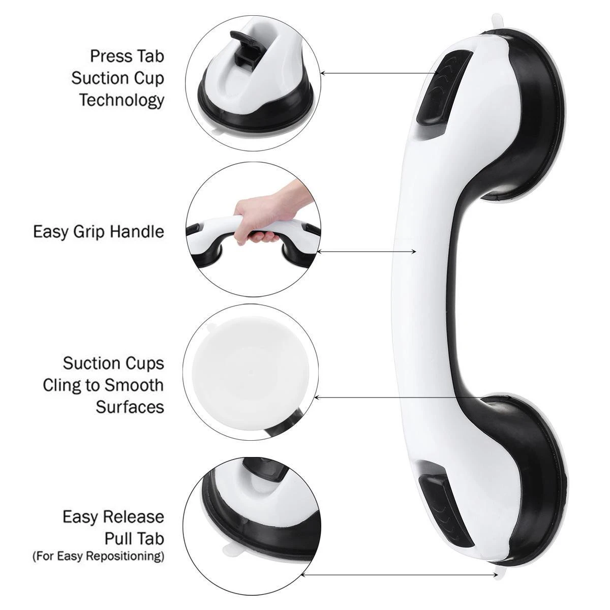 Een compacte steun/ handvat die grote onafhankelijkheid biedt door het verstrekken van stabiliteit en veiligheid bij het in-en uitstappen van het bad, douche, of voor algemeen gebruik rond het huis. Het is ideaal voor diegenen die een beetje extra ondersteuning nodig hebben. Hiermee voorkom je dat je uitglijdt of valt en heb je altijd een extra handvat in de buurt. Belangrijk is wel om de het handvat correct te installeren. U kunt het product in enkele seconden installeren, zonder te hoeven boren. Installeer simpelweg door de veiligheidsvergrendeling naar beneden te duwen op een glad, stof en vetvrij oppervlakte.