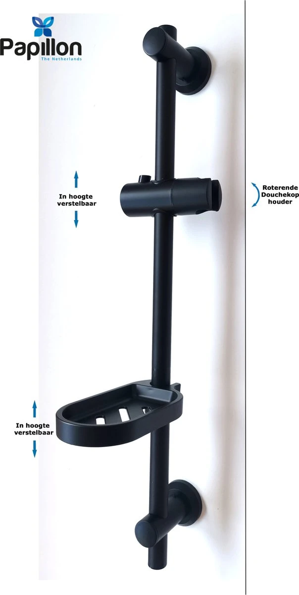 Op zoek naar een zwarte douche glijstang? Dan is deze Papillon Glijstang ideaal. De stang wordt compleet in mat zwart afgeleverd inclusief zeepschaal en verstelbaar glijstuk als handige douchekophouder.