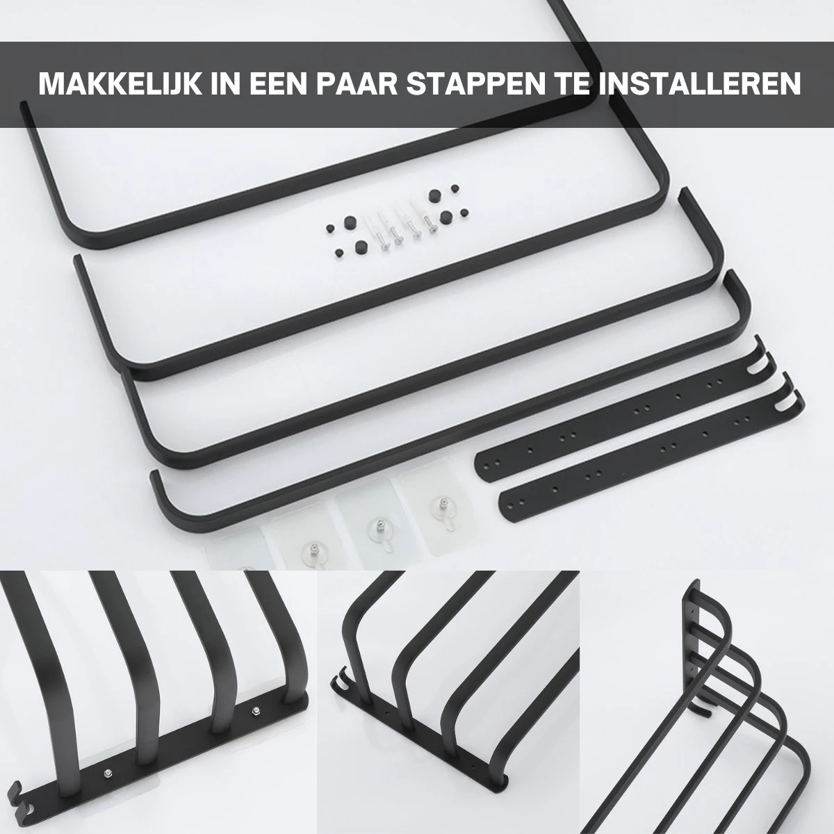 Inhoud pakket: Handdoekrek 4-armig inclusief bevestigingsmaterialen bestaande uit RVS schroeven en Fischer pluggen + installatie handleiding