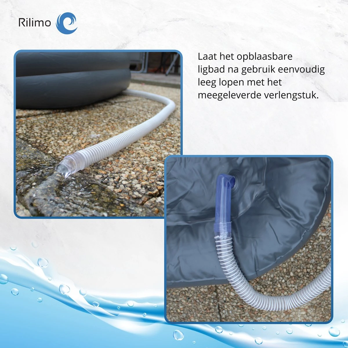 Dankzij de meegeleverde afvoerslang loopt het opblaasbaar ligbad gemakkelijk en gelijkmatig leeg.(Let op:) Zorg er altijd voor dat u de afvoerslang gemakkelijk in een waterafvoerplek kan stoppen. Zo ondervindt u geen problemen met het weg laten lopen van het water).