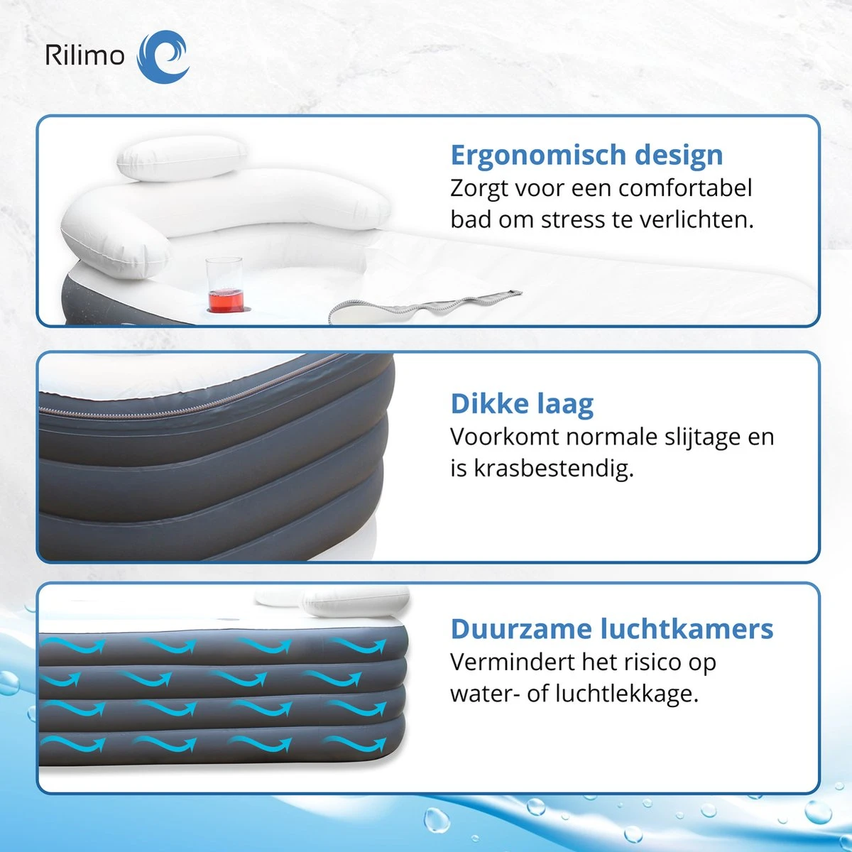 Na een lange dag even echt tot rust komen in bad? Gun jezelf een at-home spa momentje en breng je bad ervaring naar een geheel nieuw niveau met dit opblaasbare bad van Rilimo. Met een goed bad komt je rug en nek tot rust en ontspannen je spieren. Geen last meer van een harde bad rand waardoor je langer kunt genieten van jou relax momentje. Kaarsjes aan, goed boek erbij en je bent klaar voor een spa momentje.