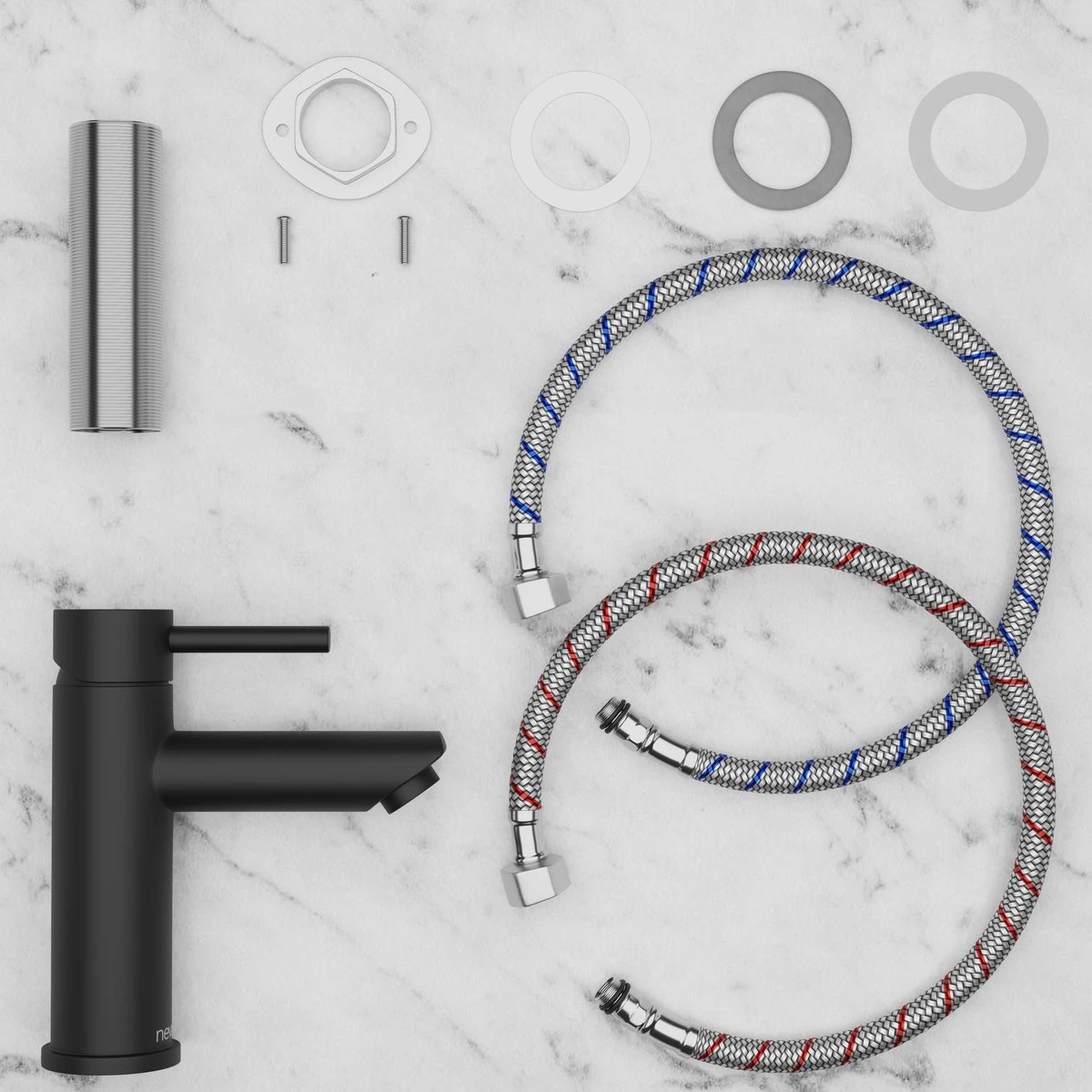 Deze wastafelkraan van Nevana is de blikvanger voor bij jou in de badkamer! Dankzij het tijdloze ontwerp misstaat hij in geen enkele badkamer. De mat zwarte accenten zijn nog nooit zo populair geweest en haast niet meer weg te denken uit de badkamer. De wastafelkraan is eenvoudig te bedienen door middel van 1 hendel boven op de kraan, waarmee je zowel de koude als de warme temperatuur kunt regelen. Regelbare temperatuur tot 80°C